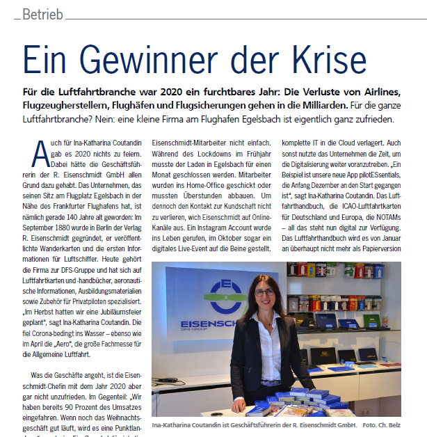 In der Transmission, dem Magazin der DFS Deutsche Flugsicherung GmbH, ist ein Bericht über Eisenschmidt und das Geschäft in Zeiten von Corona erschienen. » Hier den ganzen Artikel lesen.